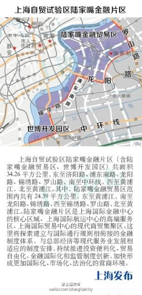 上海市政府新闻办公室官方微博“上海发布”4月27日发布消息称,中国上海自由贸易试验区官网发布扩区后4大片区地图、功能定位。除了原有的综合保税区28.78平方公里,还包括陆家嘴金融片区(含陆家嘴金融贸易区、世博开发园区)34.26平方公里、金桥开发片区20.48平方公里、张江高科技片区37.2平方公里。