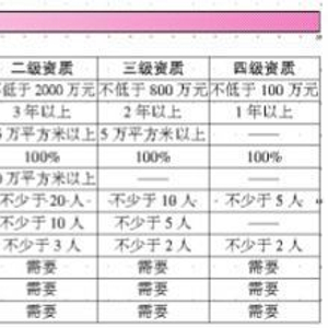 京汉置业的主营业务为房地产开发,因此其母子公司必须持有房地产开发企业资质,这对于该公司的经营是必不可缺的,这对于该公司的可持续经营能力和盈利能力起到了举足轻重的作用。根据建设部于2000年3月发布的《房地产开发企业资质管理规定》,房地产开发各级资质需满足的必要条件如附表所示,但就是这项至关重要的行业法规,对于京汉置业而言,其母子公司在这一方面均存在着很大问题。