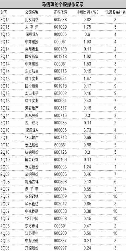 历数马信琪2005年以来的持股情况,除深振业A、中金岭南、中南建投、珠江实业、国投新集外,其余几乎所有公司持股周期均为一年。即便是前述深振业A、中金岭南等5家公司,持股周期也普遍在半年之内。如中南建投2014年一季报显示,马信琪是第三大流通股东(持股1.53%),2014年第二季度,马信琪依然位列中南建投前十大流通股东之列,持股降至1.03%;而在中南建投2014年三季报中,马信琪从前十大流通股东中消失。