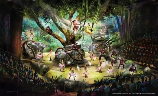 “人猿泰山:丛林的呼唤”是上海迪士尼乐园娱乐演出中的一部原创作品,将在歌舞艺术中心“故事舞台”上演。此剧将利用中国的杂技重新演绎这段冒险的故事。比如杂技演员用其柔韧的身体展现丛林的藤蔓,用转盘子再现丛林的花朵;而泰山和珍妮的爱情故事,将利用空中杂技体现。