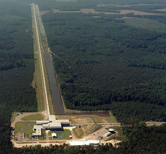 物理学家在地球上建了一大堆探测器。其中,这次成功的LIGO在美洲东西海岸各有一个探测基地。