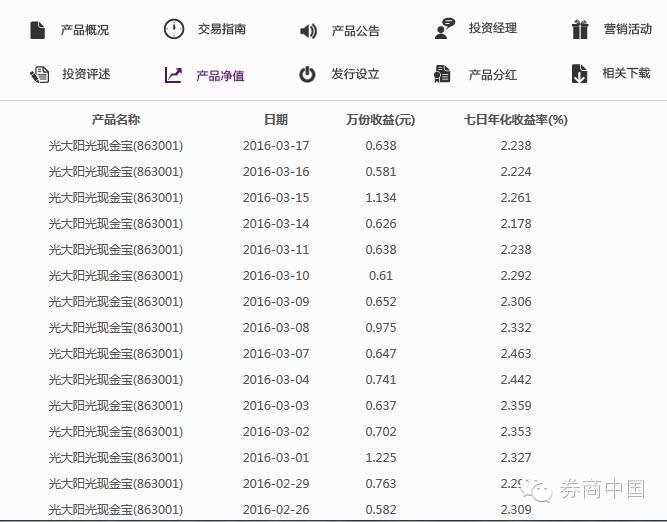 光大证券阳光天天盈&现金宝目前,光大证券的现金类产品有2种,分别是光大证券“阳光现金宝”和“天天盈”。其中,阳光现金宝与国泰君安的“现金管家”类似。
