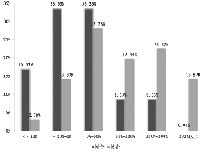 从ROE提高幅度的角度分析。从中期角度来看,借壳后,上市公司的ROE水平明显提高,ROE分布整体右移,ROE的众数区间从0-10%,上升到10%-20%,ROE在20%以上的公司数量也大幅增加,而且上市公司借壳重组后的次年,没有出现一例借壳后ROE小于0的案例。