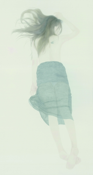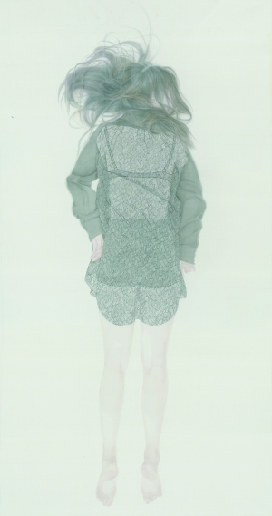 在徐华翎的作品中,一些符号性的元素频繁出现,比如蕾丝、纹身、隐去面部的身体等。这些元素支撑和构建起了徐华翎所要追求的审美情趣。在徐华翎看来,这些元素能够体现出很多气质,比如柔软度、脂粉气,同时还会有一些透明的感觉。这些元素以及绢的材质来表现女性的那种感觉,都是很搭配、很切合的东西。“我对这个年龄段的女性比较感兴趣,这种少女的感觉能够更好体现一些女性唯美的东西。年轻女孩形象与当下社会的感觉相契合,小型纹身也是这个时代才有的东西,这种选择其实是个人审美的一种表现方式。”