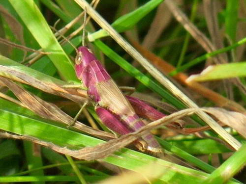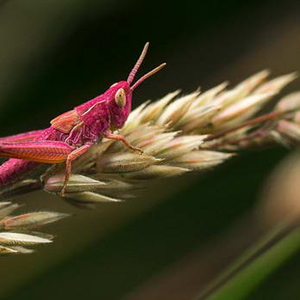 蚱蜢通常是绿色、褐色或者是两种颜色的结合,因此他们可以和周围的背景融为一体。人们通常认为基因变异导致了粉色蚱蜢的出现,这种原理同样也是动物白化病出现的原因。不幸的是,它们鲜艳的颜色使它们很容易被捕食者发现,因此十分稀有。