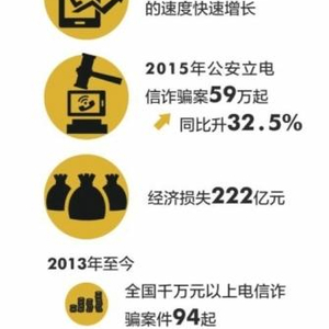 公安部数据显示,我国电信诈骗案件每年以20%- 30%的速度快速增长,2015年全国公安机关共立电信诈骗案件59万起,同比上升32.5%,共造成经济损失222亿元。2013年至今,全国共发生被骗千万元以上的电信诈骗案件94起,百万元以上的案件2085起。