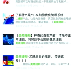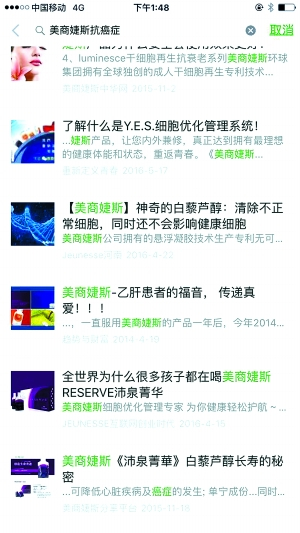 在微信中搜索“美商婕斯”,就会有数百条文章出现,相关公众号数量也十分庞大。这些公众号中推送的主要信息一般围绕着“为什么白藜芦醇能修复百病、美商婕斯见证肺癌晚期、血糖”等被医生判了“死刑”的癌症晚期神奇康复的内容出现。