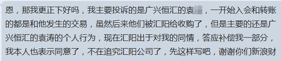 1月10日上午,新浪财经工作人员联系汇阳投资相关负责人,其称,经查证,袁先生并非本公司职员,其借用汇阳投资名义属于其个人行为,与汇阳投资无关,公司确实有收购一些公司,但至于是否收购广兴恒汇或是与之合作,其表示并不太清楚。而就声明书一事,其表示并不是退钱,而是在李先生配合汇阳投资把负面影响消除之后,再配合李先生去核实,看能不能找到一些线索,把这个事情处理一下。