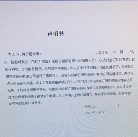 1月9日晚,李先生告知新浪财经,称汇阳投资相关负责人联系他,说只要自己撤诉,再写一份声明说就可以退钱。声明书如下: