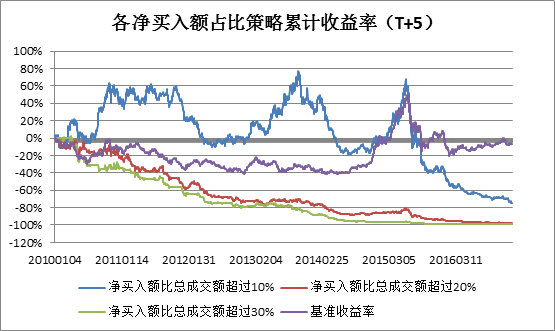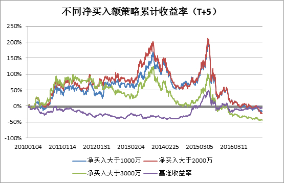 下图中是对第二种思路的证伪,我们发现随着净买入额增大,在2012年之前这种策略还有效,但是此后净买入额增大并没有带来更多的收益。