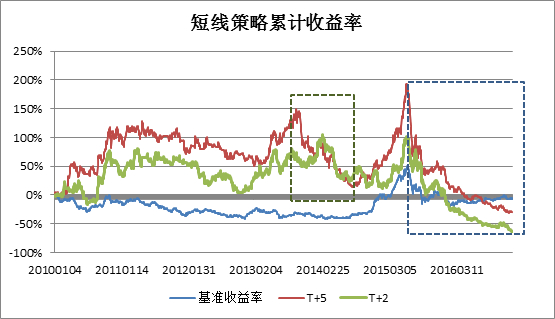 从上图中,我们发现了什么?那就是这种策略曾经辉煌过,但是从2013年下半年后这种策略就成了“金钱黑洞”!若不是一轮大牛市,这种策略可能亏的更多!在这种通过龙虎榜信息进行短线交易最辉煌的时期,很多基于基本面因子的策略普遍黯然失色,相反这一时期打板族、追涨停等策略最有效的时期,诞生了如“赵老哥”、“鹤瑞仙”等一批民间股神。然而该策略逐步被市场熟知并模仿后,其有效性则大打折扣,在2013年后,该策略收益率大幅下降,股价从强有效的“动量效应”转为“反转效应”。原本策略大幅跑赢了基准(沪深300),到最后却彻底跑输!所以这种操作方式的朋友需要愈发警醒:一旦策略被大量模仿,其有效性堪忧!而且我们还发现即使是短线策略,持有较长时间(5日)还是要比很短的时间(2日)表现更好,所以持有期越短、收益越好的策略似乎站不住脚。