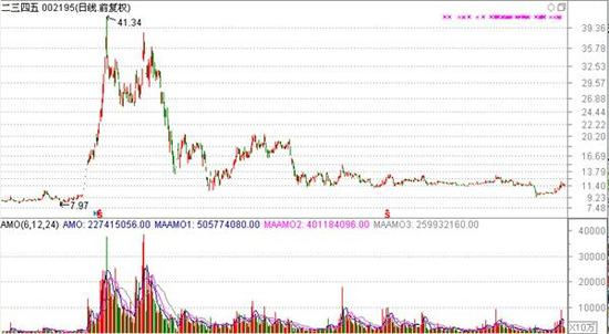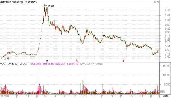 如上述所说的海虹控股,随后股价就开始快速回落,从15.64元最低跌至5元(前复权)附近。