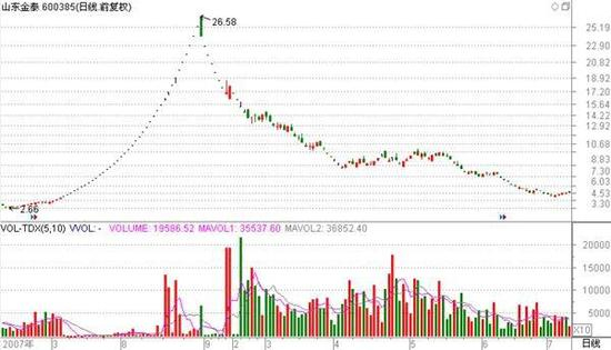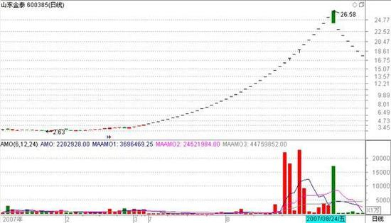 下面这只股票走势更为经典,这是著名牛散刘芳的成名作山东金泰(当时叫ST金泰),经历几十个涨停板。