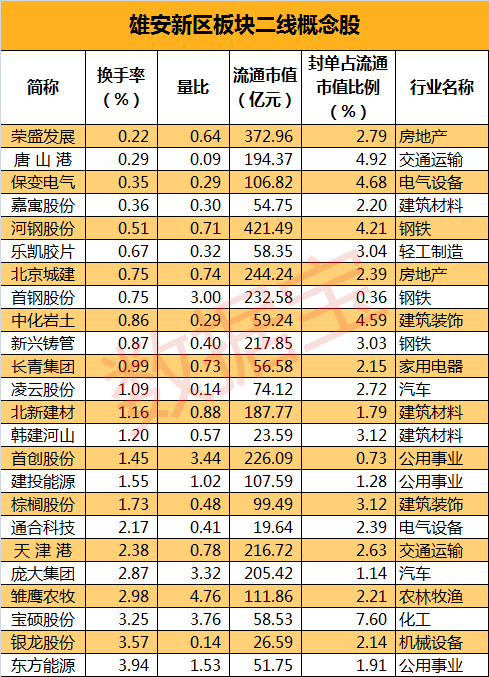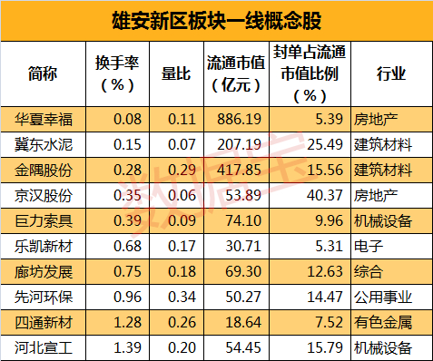 房地产股2只:华夏幸福、京汉股份。对于市场人士心目中的一线龙头而言,华夏幸福唯一的弱点就是市值偏大,这不妨碍它目前成为雄安新区概念房地产股的龙头,整个板块全日最低换手率意味着它在第一波行情中有着极高的市场认同度。