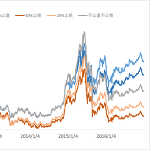 如果按照定投的方式,再加上止盈止损的条件,结果会怎样呢?牛熊交易室金工团队分别按30%和50%止盈、10%和20%止损和不做止盈止损操作的绘制了累计收益曲线,如下。我们发现,带止损的定投收益还不如不做任何操作的高,而止盈操作则可以提高定投收益。