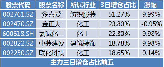 今日主力三日增仓排名中排名靠前的股票,剔除了近2月上市新股后,从主力近三日的资金流向上来看,多喜爱(002761.SZ)三日增仓占比第一,今日3日增仓占比为51.27%,3日增仓占比变化最大;从所属行业情况看,主力偏好化工行业。