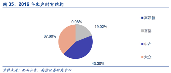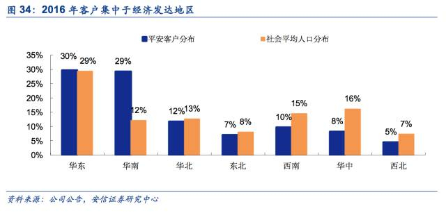 客户聚集经济发达地区,财富结构不断优化。公司在高质量客户的开发上占得先机,目前公司70%的个人客户集中于经济发达地区,平安产险上海市场份额占据三分之一,位列当地第一,而上海是我国人均可支配收入最高的省份或直辖市,并且2016年公司客户中中产及以上的占比达62%,较2015年提高了4.5个百分点,财富等级越高的客户,其人均持有合同数也越多,高净值客户人均持有合同数达10个。公司客户平均年龄约为38岁,意味着未来10年间,随着客户年龄增长,财富的积累,公司个人客户带来的价值将呈现出加速度上升的趋势。