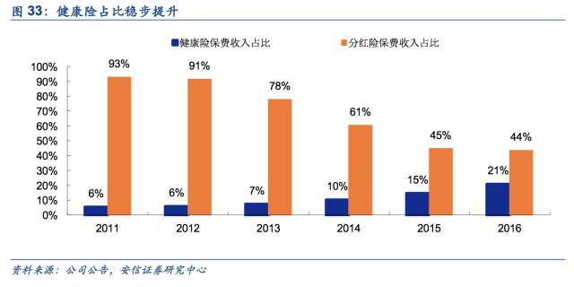 新华保险健康险占比提升。近年来公司以健康险为核心,健康险保费占比逐年提升,由2015年的15%提升至2016年的21%,健康险保费收入2016年也达到235亿元(YoY+42%),公司2015年推出健康无忧产品,2016年健康无忧C款重大疾病保险贡献原保险保费达到59亿元,在公司产品中排名前三。与其他产品相比,健康险产品新业务价值率较高,随着健康险占比的提升,公司整体新业务价值率将不断提高。