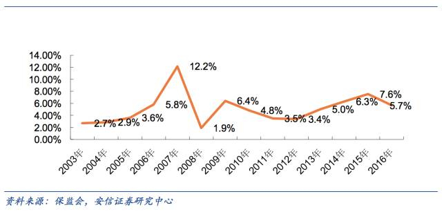 行业投资收益率近年维持在5%左右。2014年以来保险行业投资收益率维持在5%以上,2016年由于下半年股市震荡使得投资收益率较之2015年有所回落,不过基本维持在5.5%以上的较好水平,随着投资规模提升以及投资端配置多元化,预计未来收益率将长期保持稳定。