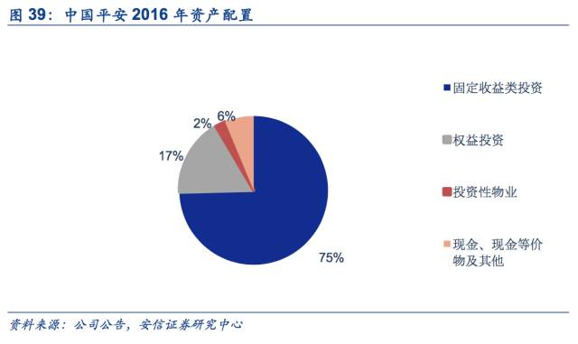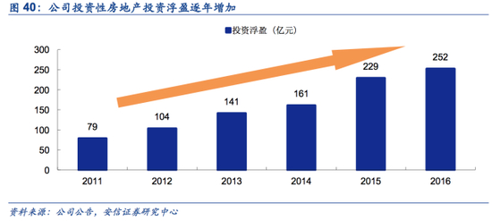 房地产投资浮盈较高。公司投资性房地产以历史成本计价,使得该项目下存在大量投资浮盈。根据2016年数据,平安的投资性房地产净值为424亿元,而公允价值达到676亿元,投资浮盈已经高达252亿元。