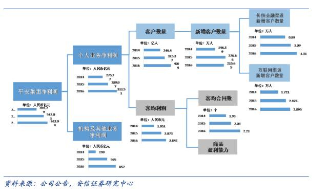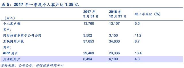 线上线下协同获客,客户规模持续增长。得益于在传统金融和互联网领域的全面布局,公司获客渠道广泛,获客能力持续提升,截至2017一季度公司个人客户达1.38亿,较年初增长5%,互联网用户达3.77亿,较年初增长8%,互联网用户正源源不断地转化为个人客户,一季度互联网渠道新增客户占全部新增客户的17%,我们认为代理人规模的增长将继续提升传统金融获客能力,2017年一季度公司代理人规模增速达到27%,而互联网渠道建设的逐步成型将推动更多的互联网用户转化为客户。