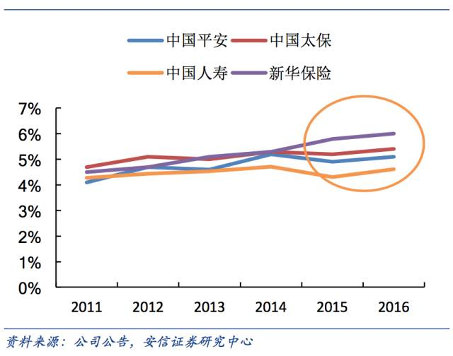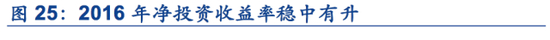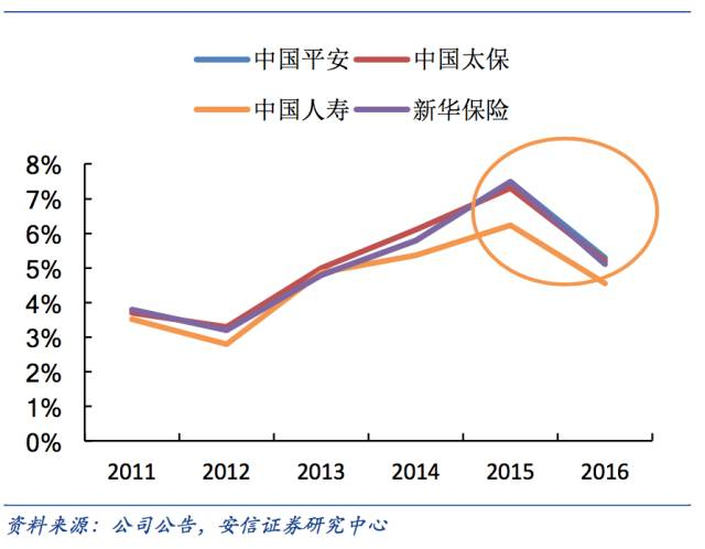 (4)投资收益率口径较多,不同口径的投资收益率变化趋势未必相同,如上市险企2016年总投资收益受到股市震荡影响普遍有所下滑,而净投资收益率受到利息收入和分红收入提升等因素的影响整体有所上升。