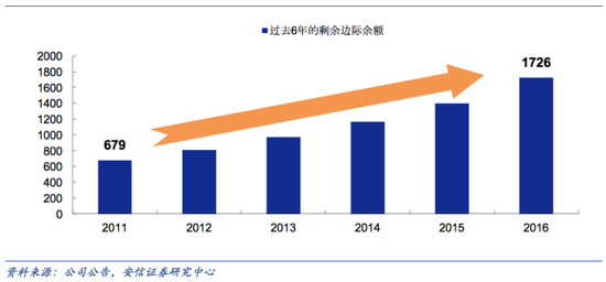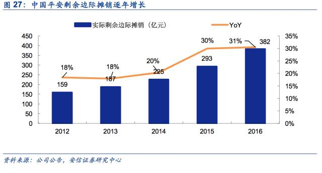 平安寿险截至 2016 年末剩余边际余额为 4546 亿元(YoY+37%),受益于长期保障型业务占比持续提升,剩余边际摊销逐年稳步增长,2016 年达到 381 亿元(YoY+31%,其中长期保障型业务贡献占比 69%)。中国太保 2011 年至 2016 年间剩余边际复合增速达到 21%,截至2016 年末公司剩余边际余额达到 1726 亿元,其中保障型业务贡献较大,占比高达 63%。
