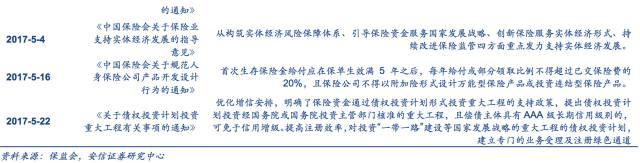 2016年以来监管层相继对保险公司中短期产品、股东资质、投资行为等强化了监管,严格限制了资产驱动负债的经营模式。承保端方面,产品本质弱化成监管重点,监管部门密集出台了大量新政,其中针对“产品本质弱化”等人身保险产品现象进行了着重监管,2017年保监会颁布了《关于规范人身保险公司产品开发设计行为的通知》,引导规范保险公司产品设计开发行为,防范经营风险;投资端方面,2017年7月保监会发布《保险公司股权管理办法(第二次征求意见稿)》股权新规加强险企股东管理,此次股权新规在此前《保险公司股权管理办法(征求意见稿)》的基础上,进一步完善了各个条款,将股东分类从三类细化到四类,提升了股东准入门槛,延长了股东持股时限,并限制了单一资管计划持股比例,加强穿透式监管。