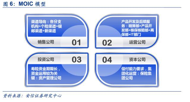 我们认为,保险集团=销售公司(Marketing)+运营公司(Operation)+投资公司(Investment)+资本公司(Capital),简称MOIC模型。