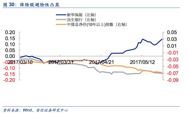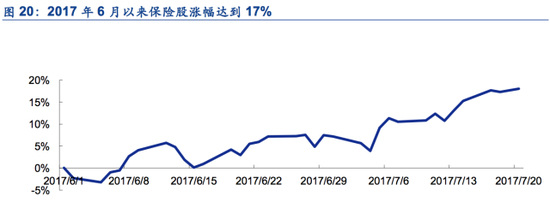 (4)我们认为2017年4月下旬以来保险股上涨的核心逻辑是:保险回归保障,死差益占比提升,负债端质量改善,使得市场震荡下保险股成为避险工具。