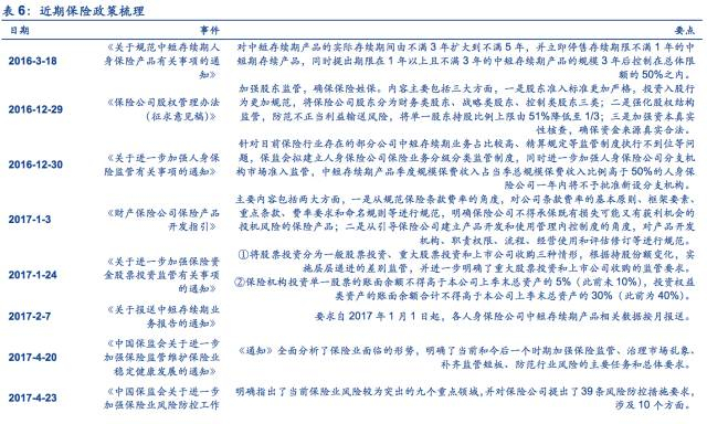 (6)趋势六:保险姓保从严监管。监管层相继对保险公司中短期产品、股东资质、投资行为等强化了监管,偿二代实现由规模导向向风险导向的转变,行业秩序更加规范,稳健经营成为首选。