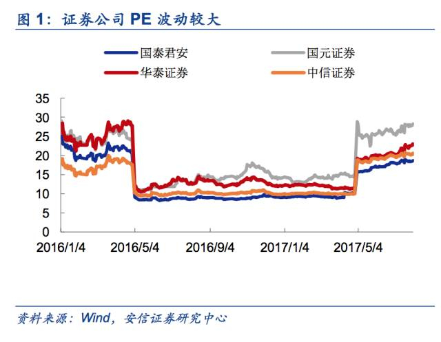 从全球范围内看,金融机构估值普遍采用市净率(PB),而较少使用市盈率(PE),主要因为金融机构利润周期性较强且波动较大,市盈率难以反映真实的经营情况。以A股上市证券公司(国泰君安、华泰证券、国元证券、中信证券)为例,2016年以来公司PE波动范围在10倍至30倍之间,而同期PB则基本只在2倍至4倍之间。