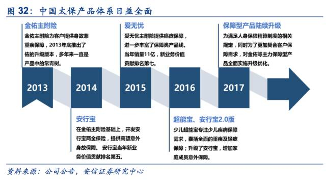 中国太保不断升级完善保障型产品体系。从2013年的金佑主附险、2014年的安行宝、2015年的爱无忧、以及2016年的超能宝、安行宝2.0,公司在开发新产品的同时,陆续对保障型产品进行升级,产品体系日益全面。