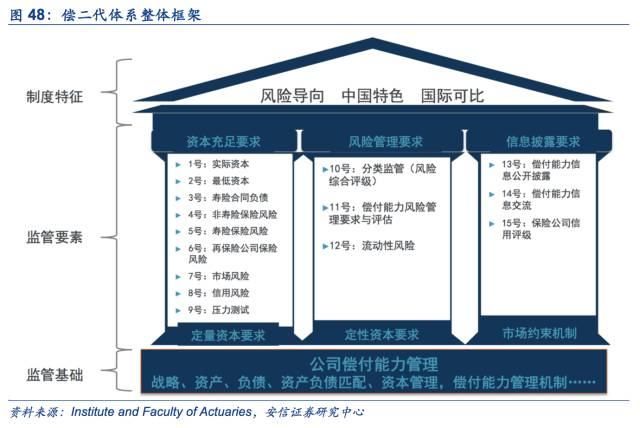 偿二代实现由规模导向向风险导向的转变。2016年1月保监会发布《关于中国风险导向的偿付能力体系正式实施有关事项的通知》,并于2017年正式启用偿二代。偿二代确立了定量资本要求、定性监管要求以及市场约束机制的风险导向“三支柱”体系,能够更加全面的评价保险业经营风险,推动偿付能力监管由规模导向向风险导向转变,与偿一代之下偿付能力只与业务规模相关(反比关系)相比较,偿二代在计算最低资本时将保险风险、市场风险等考虑在内,未来将持续推动保险公司稳健经营。