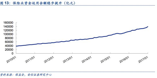 保险行业投资结构更加多元化。截至2017年5月保险行业资金运用余额达到14万亿元,其中存款和债券占比50%左右,股票和证券投资基金占比13%,其他投资占比36%,近年来行业投资资产结构逐步多元化,固收类资产占比稳步下降,另类投资占比大幅提升。