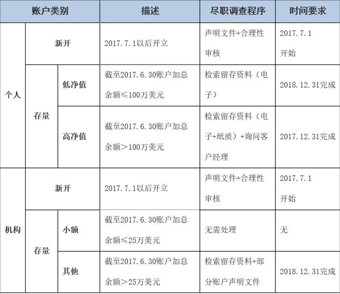 尽职调查的目标账户包括存款账户、托管账户、投资机构的股权权益或债权权益以及具有现金价值的保险合同或年金合同。这些账户不论金额大小,都需要通过尽职调查识别账户持有人是否为非居民。