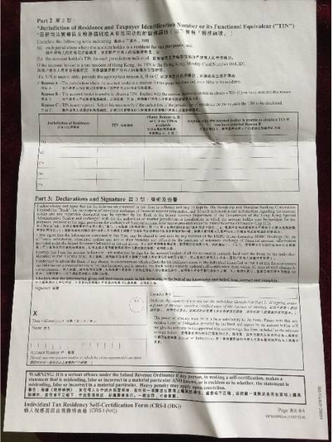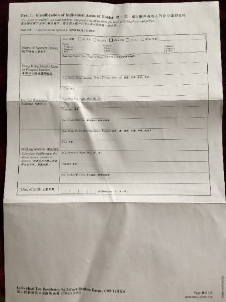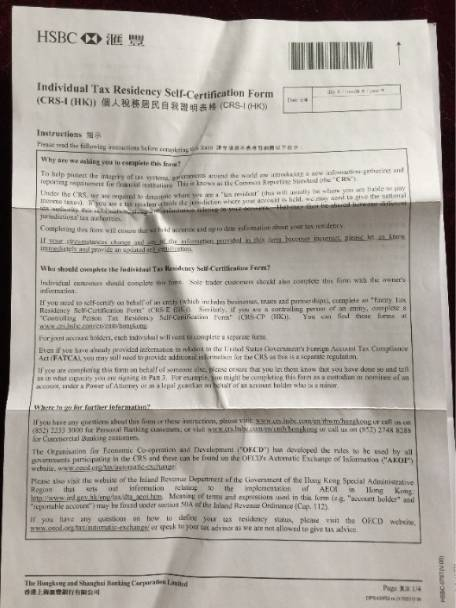 有些童鞋已经收到了金融机构要求填写的《个人税务居民自我证明表》,香港汇丰银行是这样的——