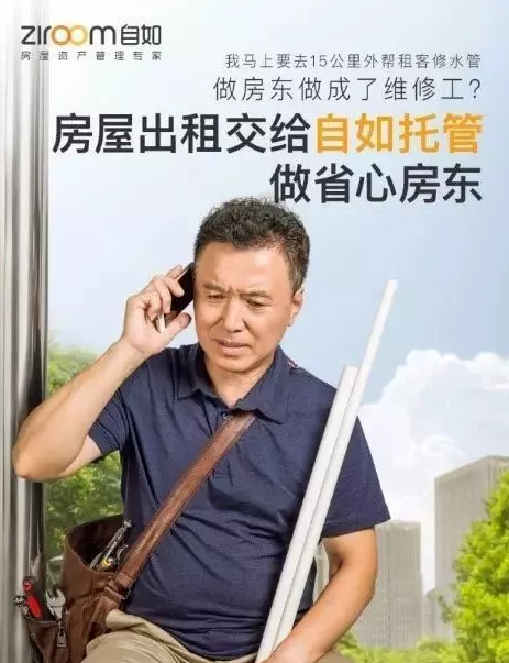 这是自如广告里的另一张宣传画,画中的广告语大意房东成了维修工,要跑到15公里外的出租房去修水管,大概表达的是“自如全方位服务,把轻松还给您”。
