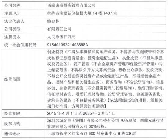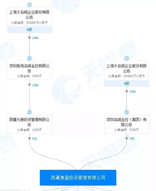 据界面新闻,在同步披露的简式权益变动报告书里,有康盛投资的一些基础资料,该公司注册资本5000万元,法定代表人鲍金林,深圳名城金控(集团)有限公司持股70%,西藏元康投资管理有限公司持股30%。进一步从天眼查了解到,深圳名城金控(集团)有限公司由大名城(600094.SH)100%控股,而西藏元康投资管理有限公司向上追溯起来同样由大名城完全控股。也就是说穿透后博信股份二股东的背后站着大名城,显然正中惊雷。