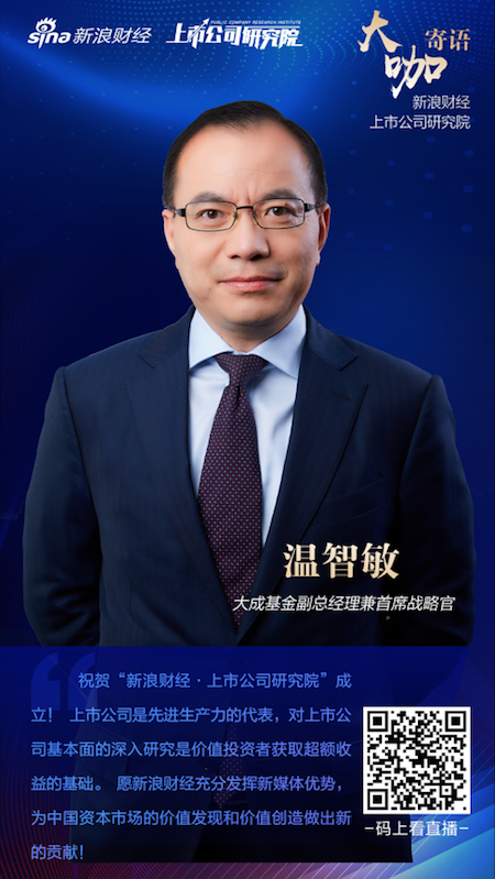 大成基金副总经理兼首席战略官 温智敏:祝贺“新浪财经·上市公司研究院”成立! 上市公司是先进生产力的代表,对上市公司基本面的深入研究是价值投资者获取超额收益的基础。 愿新浪财经充分发挥新媒体优势,为中国资本市场的价值发现和价值创造做出新的贡献!