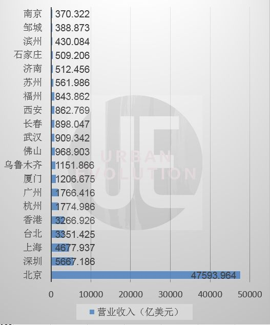 除北京外,深圳、上海、台北、香港、杭州、广州、厦门、乌鲁木齐的世界500强企业营业收入总和也超过千亿美元。无一例外的是,这些城市都驻扎着不止一家世界500强。