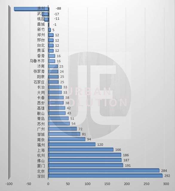 城叔以所在城市分类,统计了每家企业相较去年的排名变动情况,并把所有排名变动加总求和,发现40座城市中,仅4座城市排名出现下降,其余城市排名总和都出现不同程度上升。