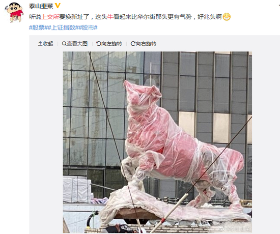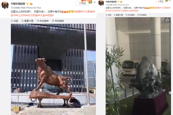 新浪财经讯 11月4日消息,今日有多位微博大V称,上交所新楼门口树新牛。图片显示,新牛牛头向上。