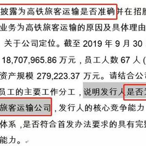 证监会反馈意见认为,鉴于公司并不直接从事高铁运输服务,而是委托北京局、济南局、上海局等进行从事高铁运输服务。因而必须解释清楚是否真的是高铁旅客运输公司。