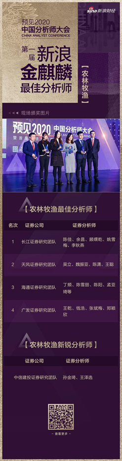 新浪财经讯 11月28日,在预见2020•中国分析师大会上,新浪金麒麟最佳分析师评选结果出炉。合计1.8万亿规模主动权益基金从35家券商的500个报名团队中,票选出最佳分析师149名、新锐分析师83名、最佳研究所7个、特色研究所3个。