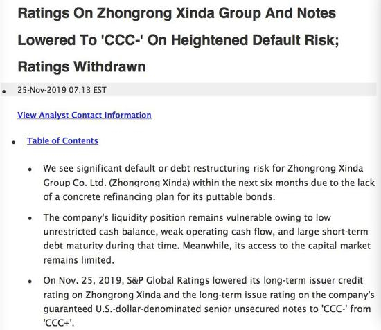 这是标普3个月内第二次调低中融新大评级。今年9月,标普就将中融新大的长期发行人信用评级以及该公司担保的高级无抵押美债从“B”下调至“CCC+”重大风险级。