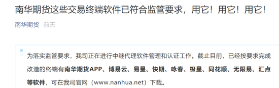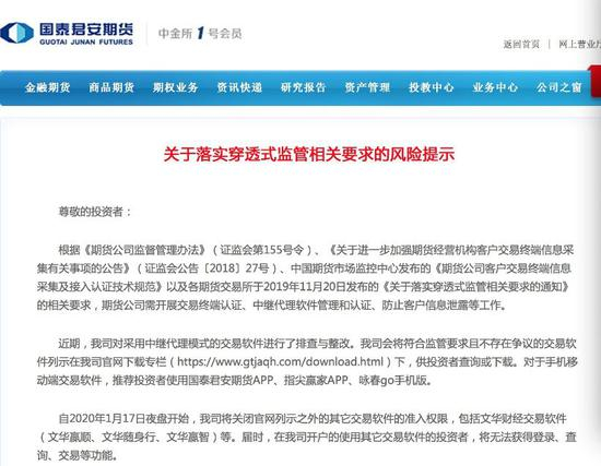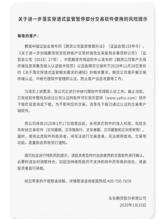 包括永安、南华、国泰君安期货等在内的头部期货公司日前纷纷通过官网、微信和短信等多种方式发布声明,称为落实穿透式监管相关要求,将自2020年1月17日夜盘开始,暂停或关闭接入文华财经交易软件,包括文华赢顺、文华随身行、文华睿期、文华赢智和文华库安等。届时,使用此类软件的投资者将无法进行交易登录、无法使用查询、交易等功能。若重新启用将另行通知。