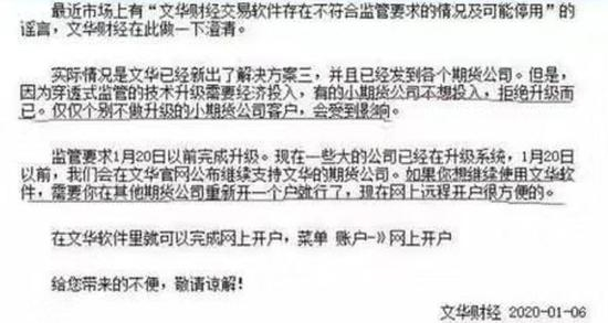 1月12日凌晨,文华财经在发布的公告中承认公司软件不符合合规要求,“由于我司提供的云端交易服务,需要部署中台系统,中台系统的服务器因为没有部署在期货公司,暂不符合监管机构的合规要求。”