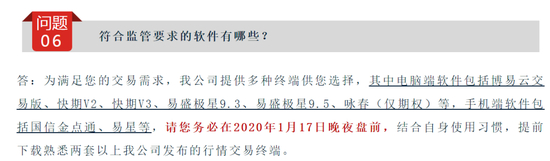 国信期货指出,目前符合监管要求的软件,电脑端软件包括博易云交易版、快期V2、快期V3、易盛极星9.3、易盛极星9.5、咏春(仅期权)等,手机端软件包括国信金点通、易星等。