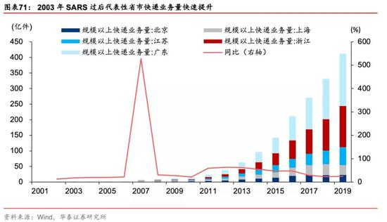 物流行业并非直接受益于2003年的非典疫情,而是受益于电商行业的崛起。非典疫情后,淘宝和京东快速崛起,带动了网上购物的热潮,物流业随后在2007年(滞后3年)迎来增速的高峰。以北京、上海、江苏、浙江、广东等发达省市为代表,整体快递业务量2007年的增速达到528%,全年快递业务量达到7.5亿件,整个市场规模很快扩大,而此后,整个快递行业迎来高速增长的时期。